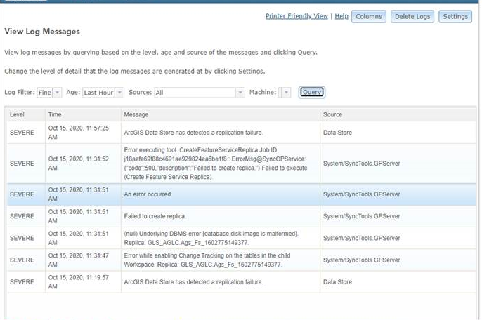 Hi Joe, Yes I went through the log at server end which shows 'ArcGIS Data Store has detected a replication failure' and alss 'Underlying DBMS [disk image is malformed]'. But I am using the same db for offline map generation in geocortex and other places. Everything works fine.