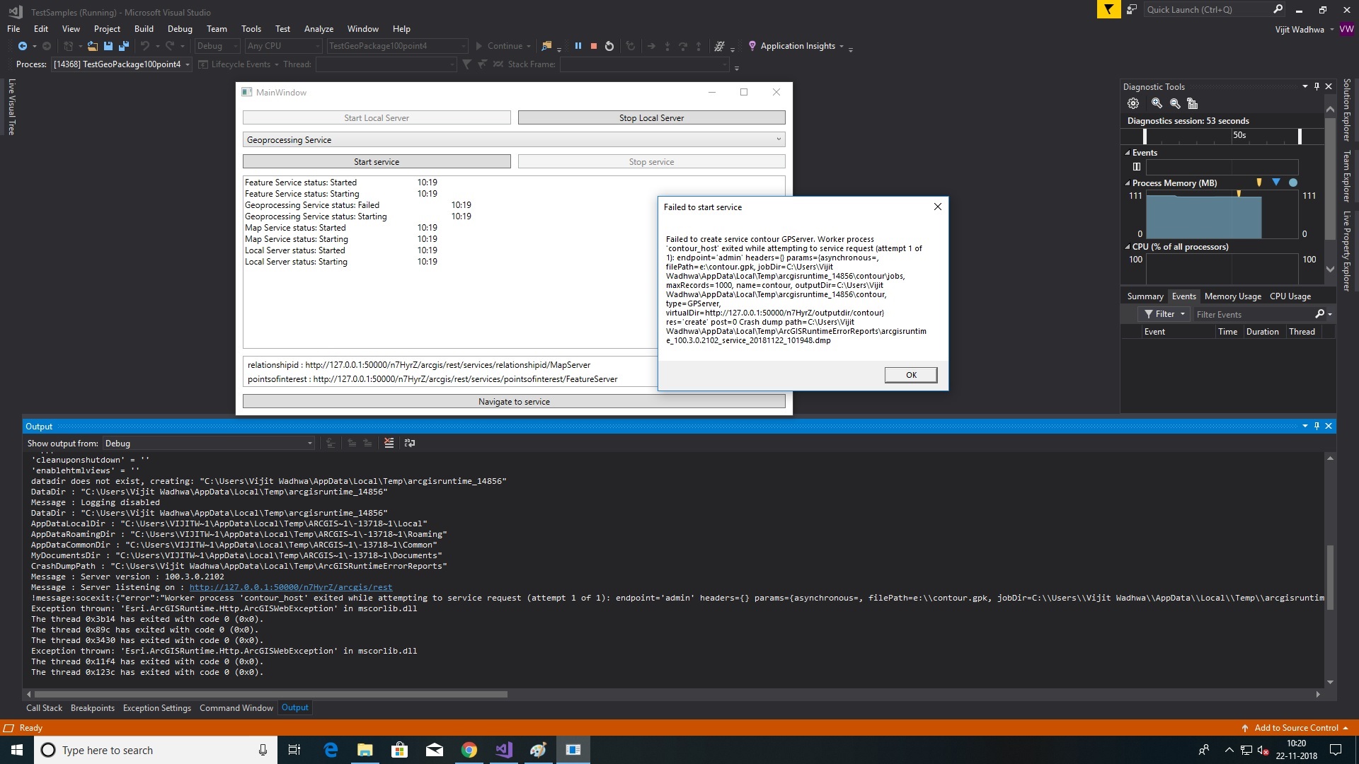 !message:socexit:{"error":"Worker process 'contour_host' exited while attempting to service request (attempt 1 of 1): endpoint='admin' headers={} params={asynchronous=, filePath=e:\\dlrl for kolkata 2\\feature to json\\contour.gpk, jobDir=C:\\Users\\Vijit Wadhwa\\AppData\\Local\\Temp\\arcgisruntime_3828\\contour\\jobs, maxRecords=1000, name=contour, outputDir=C:\\Users\\Vijit Wadhwa\\AppData\\Local\\Temp\\arcgisruntime_3828\\contour, type=GPServer, virtualDir=http://127.0.0.1:50000/q3HDdY/outputdir/contour} res='create' post=0 Crash dump path=C:\\Users\\Vijit Wadhwa\\AppData\\Local\\Temp\\ArcGISRuntimeErrorReports\\arcgisruntime_100.3.0.2102_service_20181024_110823.dmp","name":"contour","processId":-1}